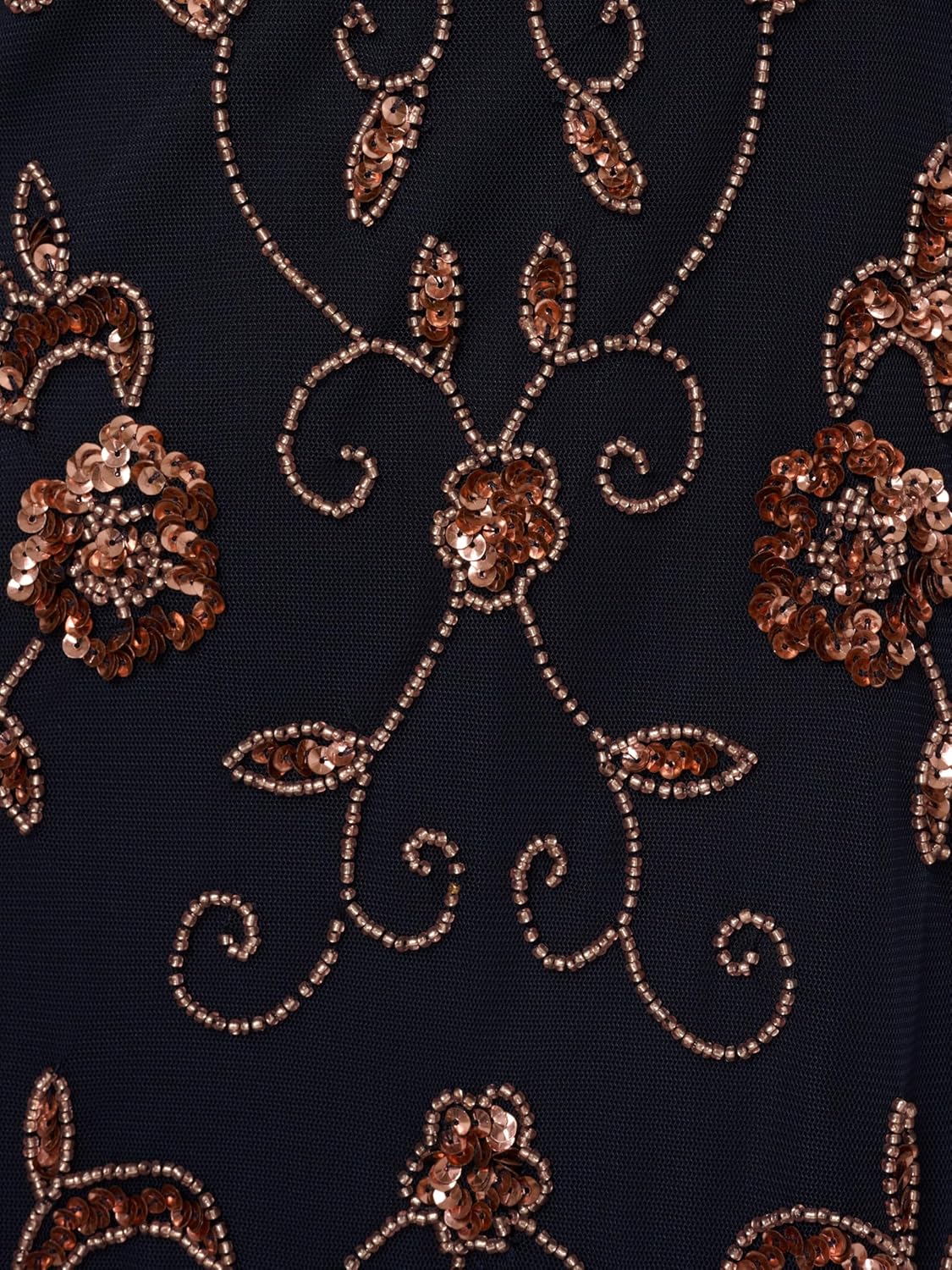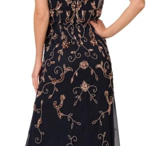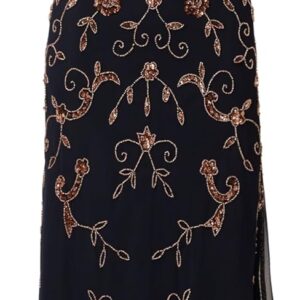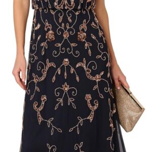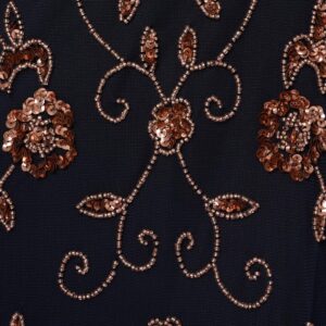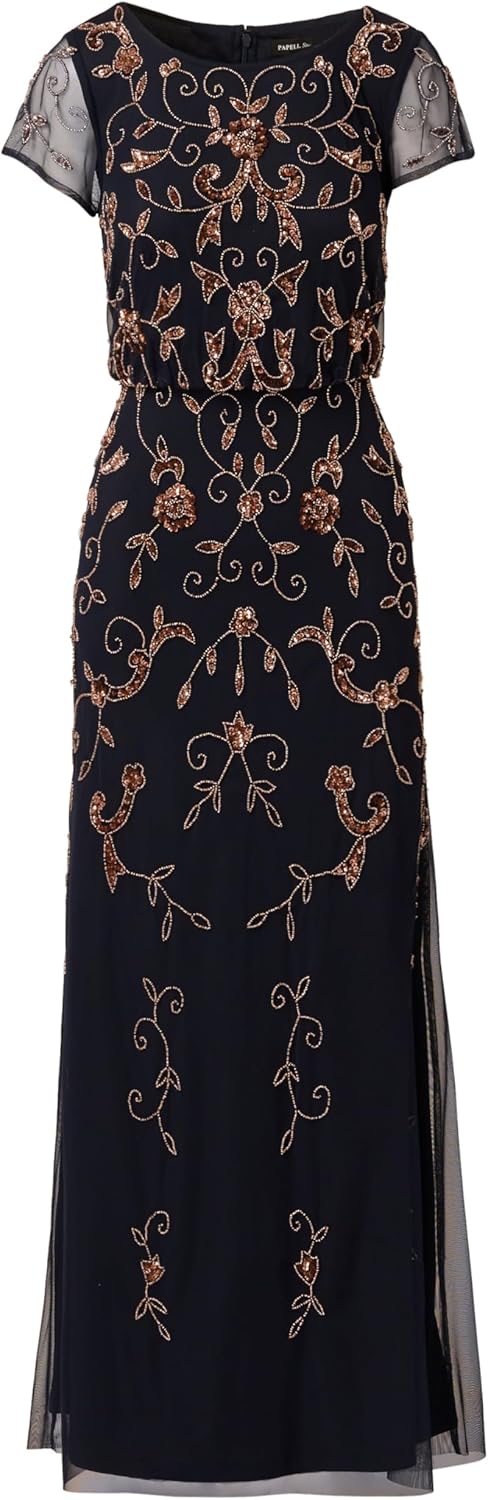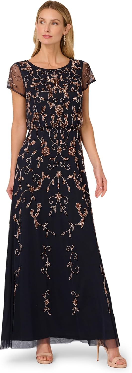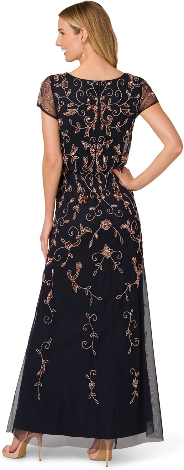 This is a soft skirt gown made out of an all over beaded embellished mesh knit fabric with a boat neckline, blouson waist, short sleeves, and zipper at the center back.