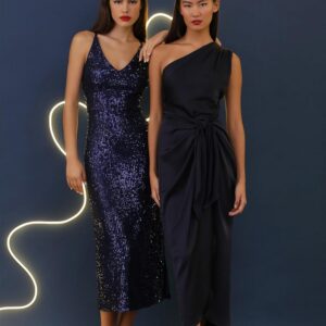 - Shirring at one shoulder, faux wrap body with side front fabric tie, and a maxi length skirt.