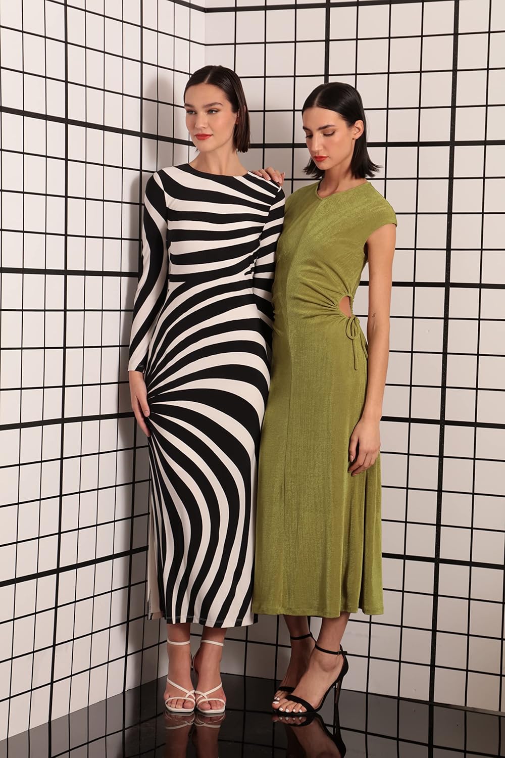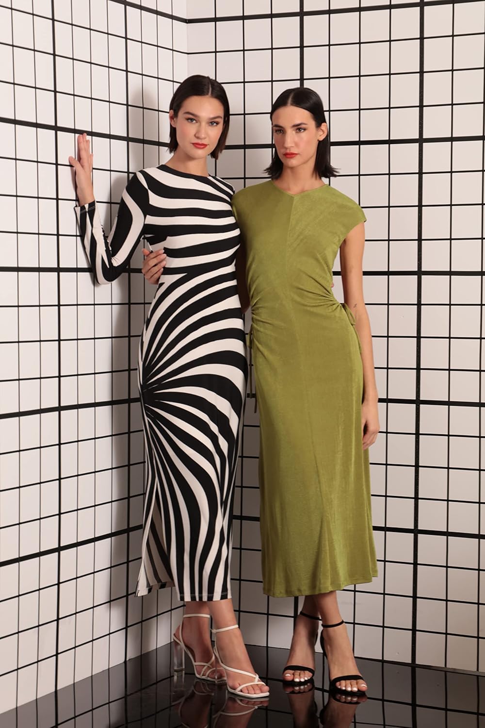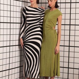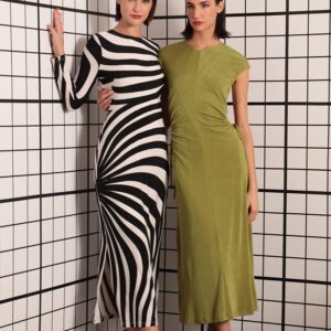 - Jewel neck, long sleeves, and a maxi length straight skirt.