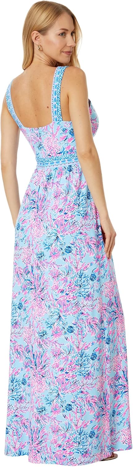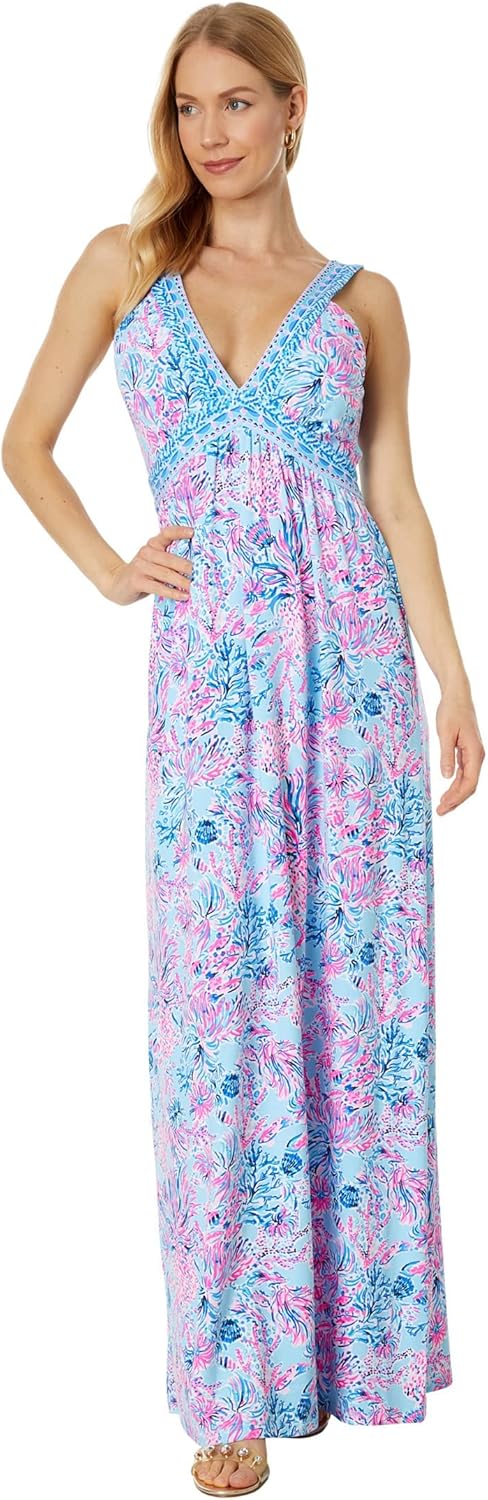 Get ready for a special evening wearing the Lilly Pulitzer Serena V-Neck Maxi Dress. Pullover style. V-neckline. Sleeveless construction. Maxi-length dress. Intricate floral print allover. 94% rayon, 6% spandex. Machine wash cold.