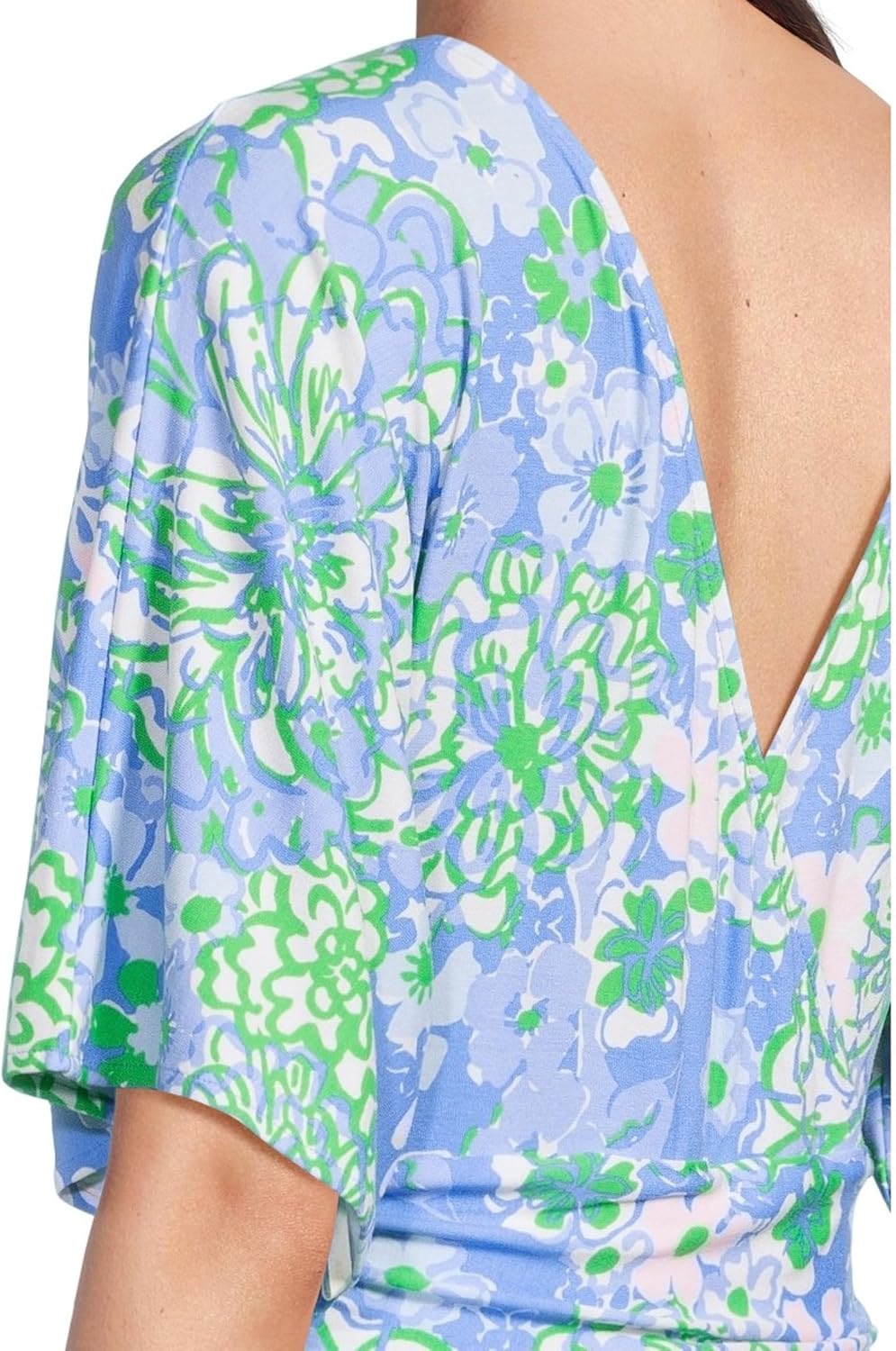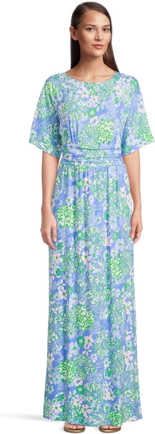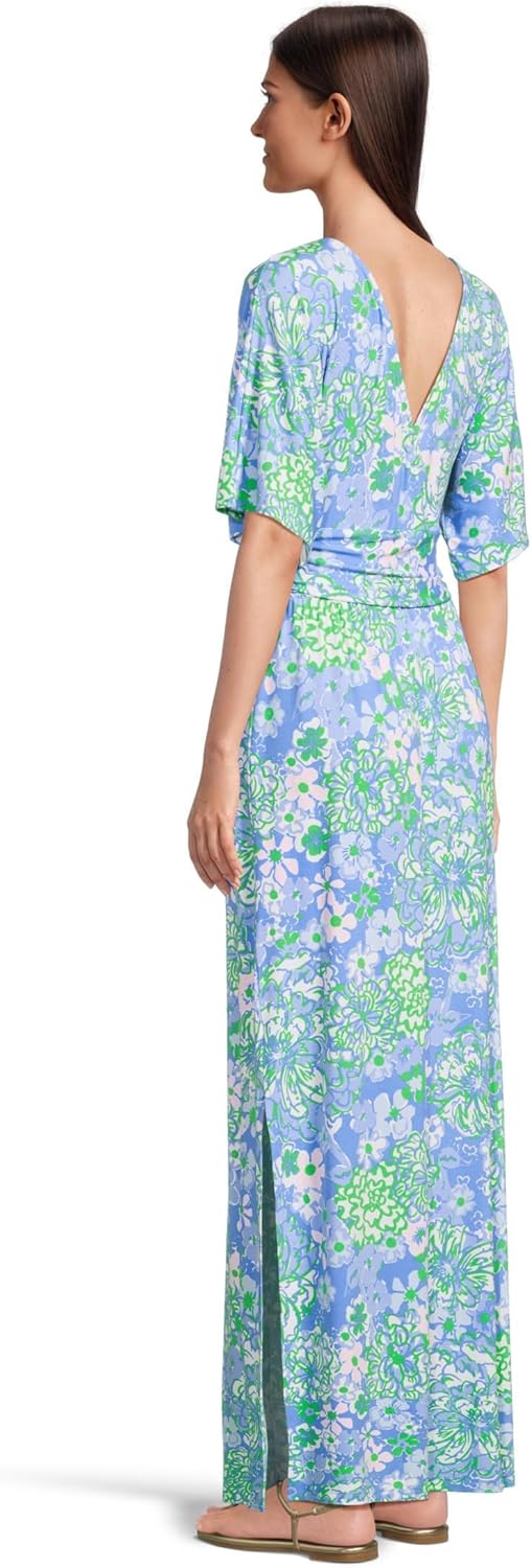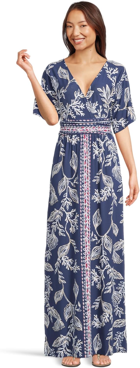 43″ Straight fit, flats length, boatneck maxi dress with back surplice, elbow length kimono sleeves, ruched waistband, and side slit