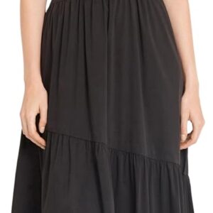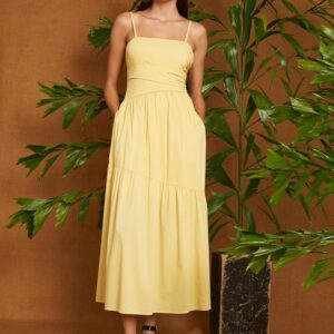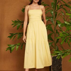 - Square neck, spaghetti straps, sleeveless, empire waist seam, ruching at left side waist, angled waist seam, pockets in the skirt’s side seams, and angled tiers in the maxi length A-line skirt.