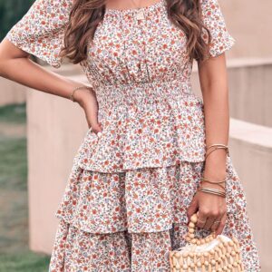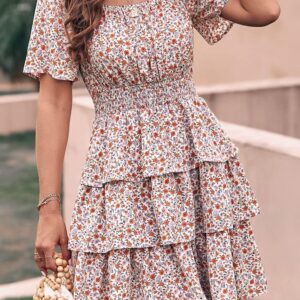 PRETTYGARDEN Women’s 2025 Floral Summer Short Dress Square Neck Short Sleeve Tiered Ruffle Boho Swing Dresses