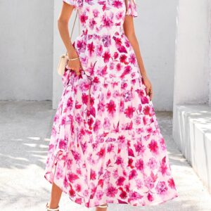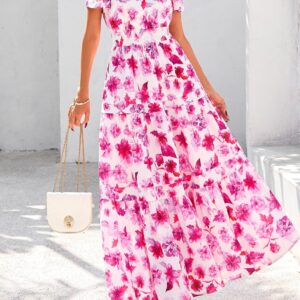 PRETTYGARDEN Women’s 2025 Summer Boho Maxi Dresses Floral Short Sleeve V Neck A Line Tiered Flowy Long Beach Vacation Dress