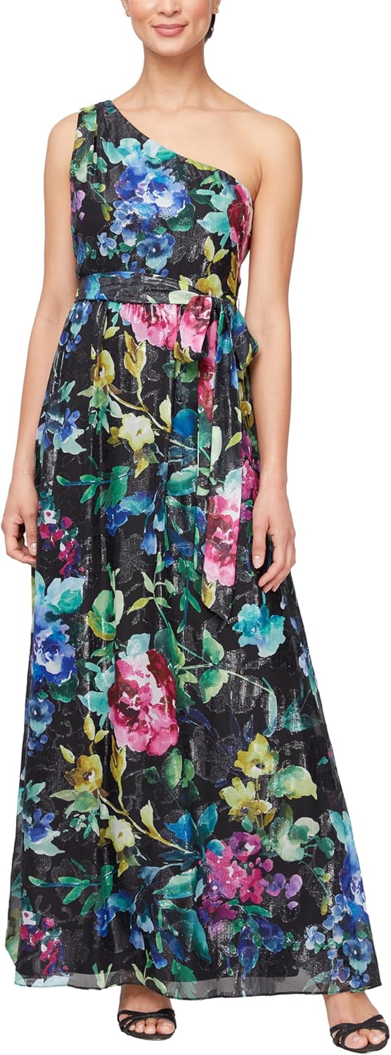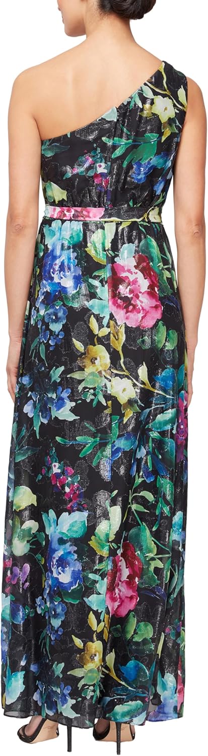 S.L. Fashions Women’s Printed One Shoulder Long Maxi Dress with Tie Waist (Petite and Regular Sizes)