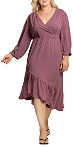 ![]() Plus Size V Neck Ruched Sleeve Ruffle Hem Midi Dress