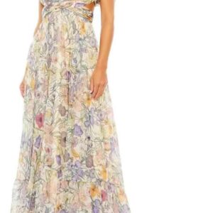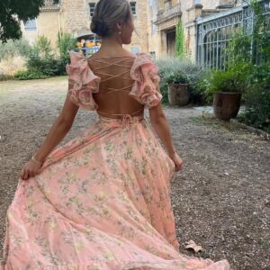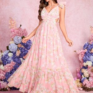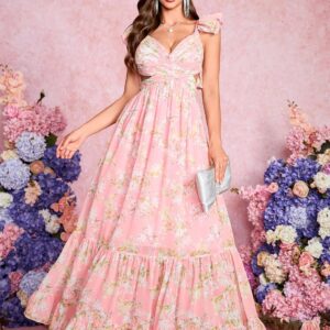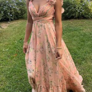 Floral Chiffon Prom Dress for Women Ruffle V Neck Bridesmaid Dresses