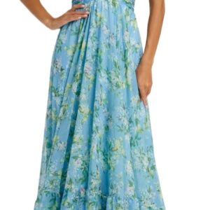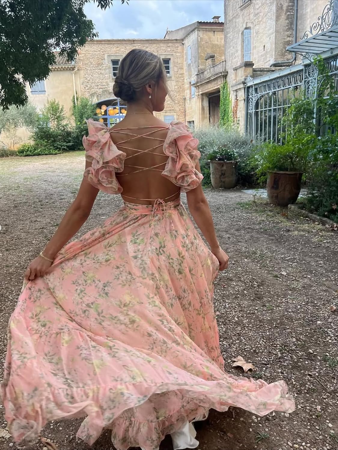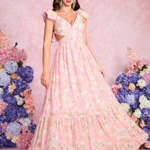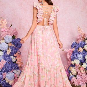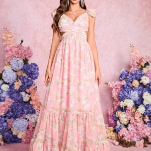 - Sleeveless maxi dress with floral print, adjustable tie at back, and flared A-line silhouette.